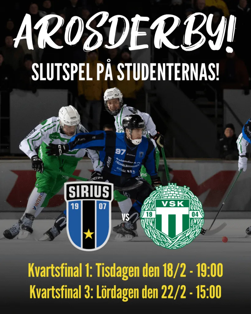 Välkomna till bandyårets hittills största publikfester i Uppsala! Däremellan spelas den den tredje matchen i Västerås den 20/2. En ev. fjärde match spelas i Västerås den 24/2 och en ev. avgörande femte match avgörs på hemmaplan den 26/2. Vinnaren går vidare till semifinal, troligen mot Villa.