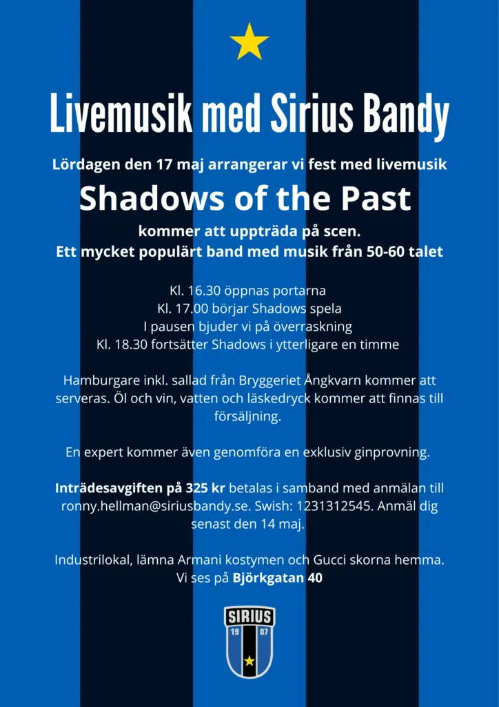 Inträdesavgiften på 325 kr betalas i samband med anmälan till ronny.hellman@siriusbandy.se. Swish: 1231312545